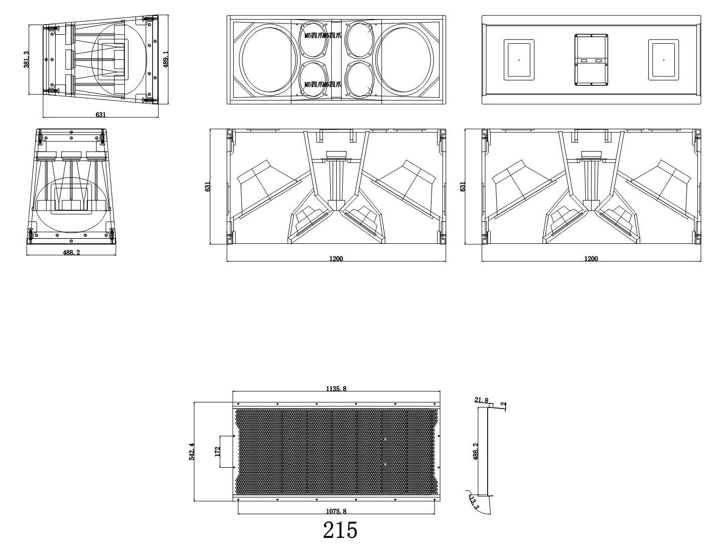 2 x 15" 钕铁硼磁路纸锥单元(3" 音圈) 4 x 8" 钕铁硼磁路纸锥单元(2" 音圈) 3 x 3" 钕铁硼磁路压缩高音(3" 音圈) |